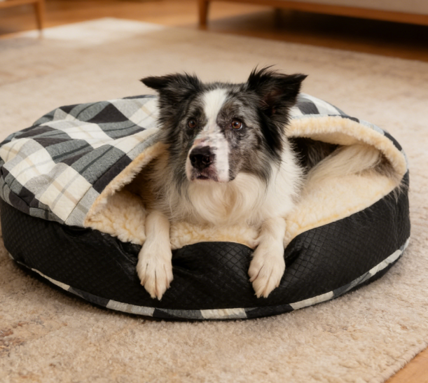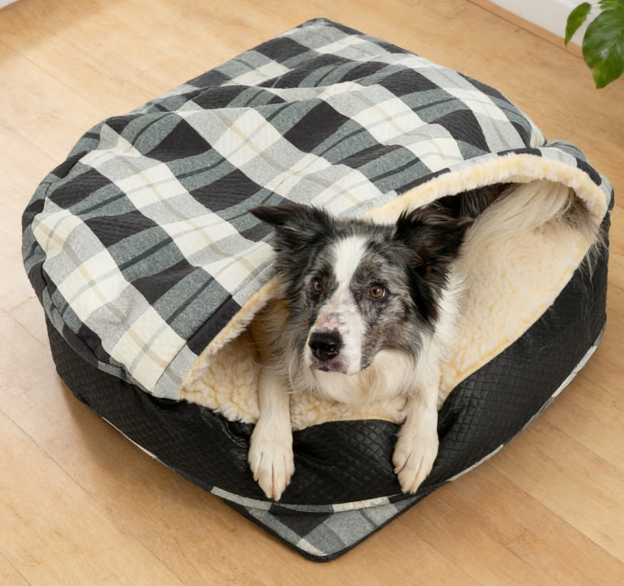 • This hooded dog bed design allows your dog to sleep nestled between soft lambskin-like lining, enjoying the comfort and warmth of being snuggled up.